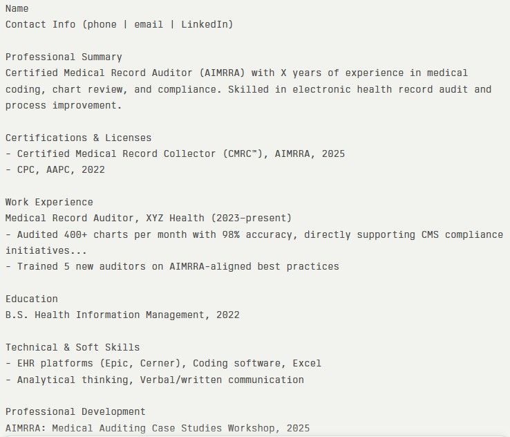 - Use clear section headings, bullet points, and action verbs relevant to medical auditing, such as “reviewed,” “abstracted,” “validated,” or “trained”.